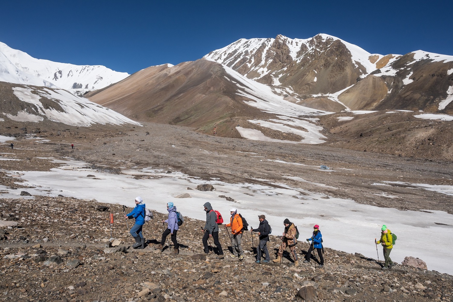 По пути нам встретятся сурки и яки, откроются виды на разноцветные Памирские горы и скалы, мощные толщи ледника пика Ленина и долину реки, которую нам предстоит перейти. Обедать будем уже в Первом лагере пика Ленина, на высоте 4400 метров над уровнем моря. Далее отдых и обустройство в лагере.
