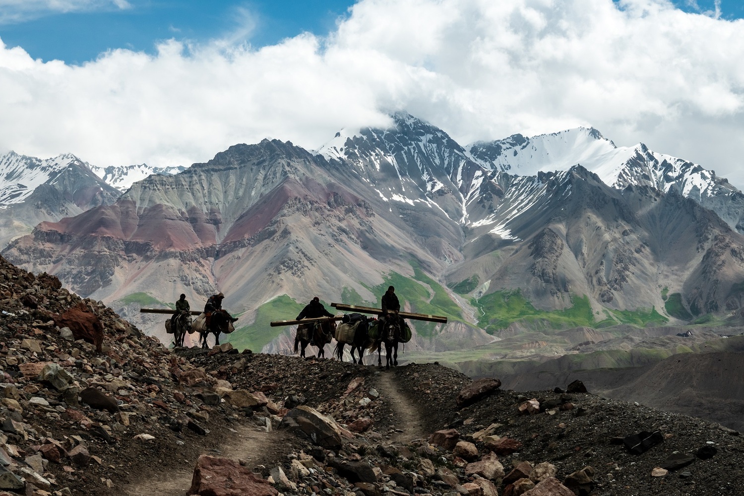 Загружаем тяжелые рюкзаки на коней и отправляемся по тропе через перевал Путешественников.